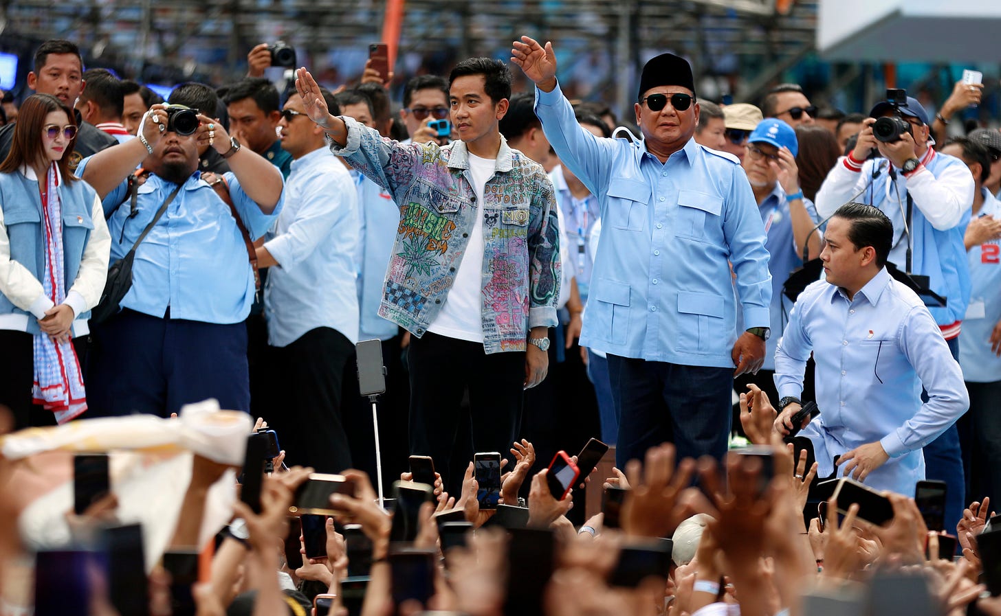 Prabowo Subianto and Gibran Rakabuming during their final campaign at Gelora Bung Karno. Photo: Indra Yoga